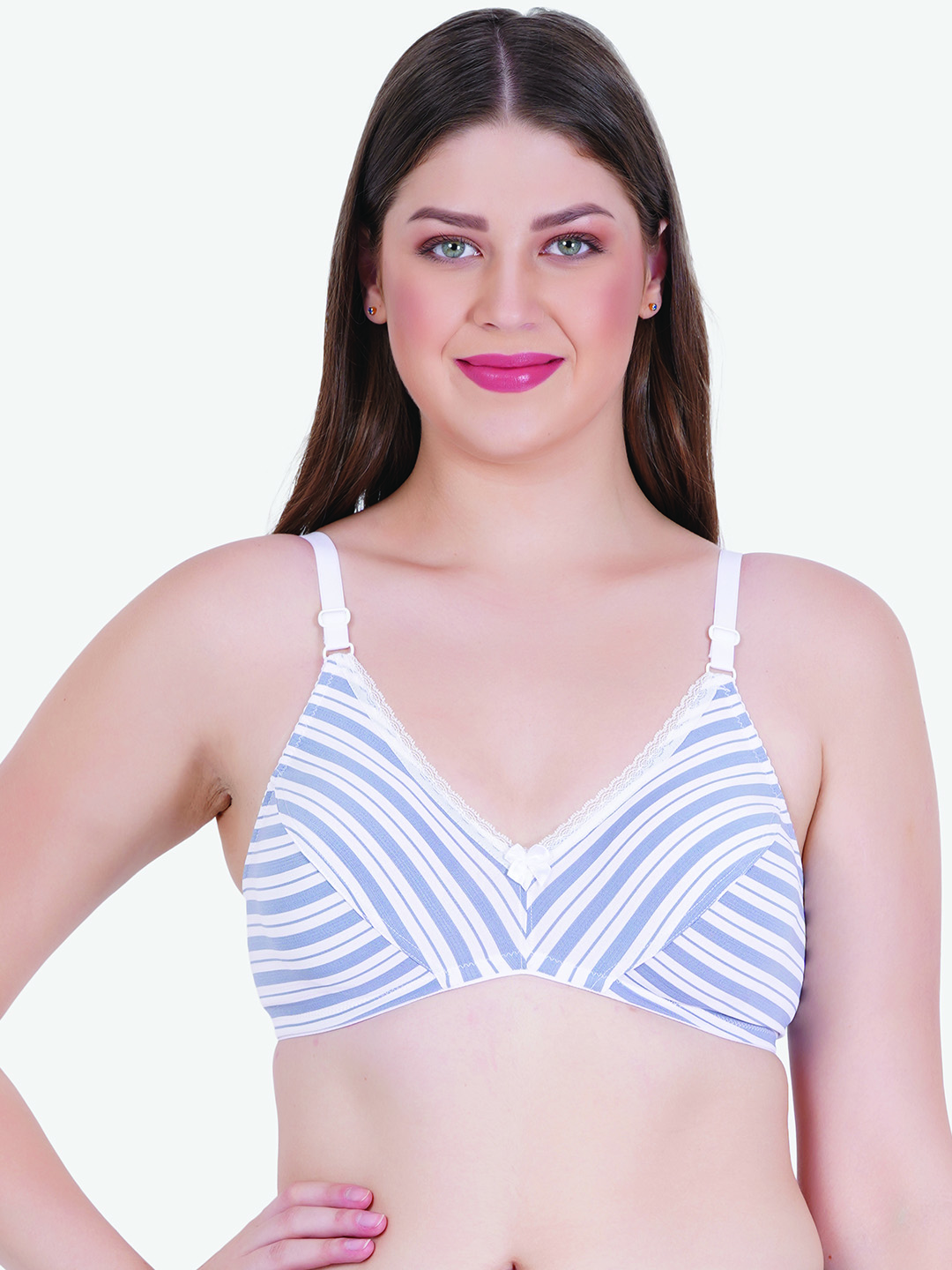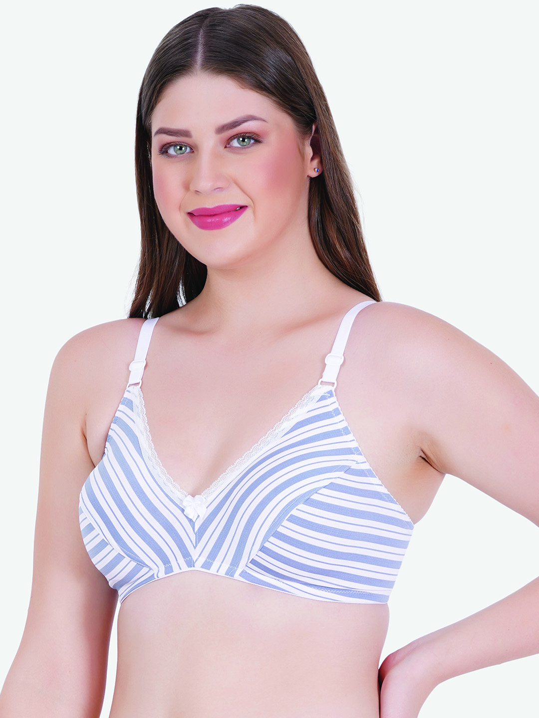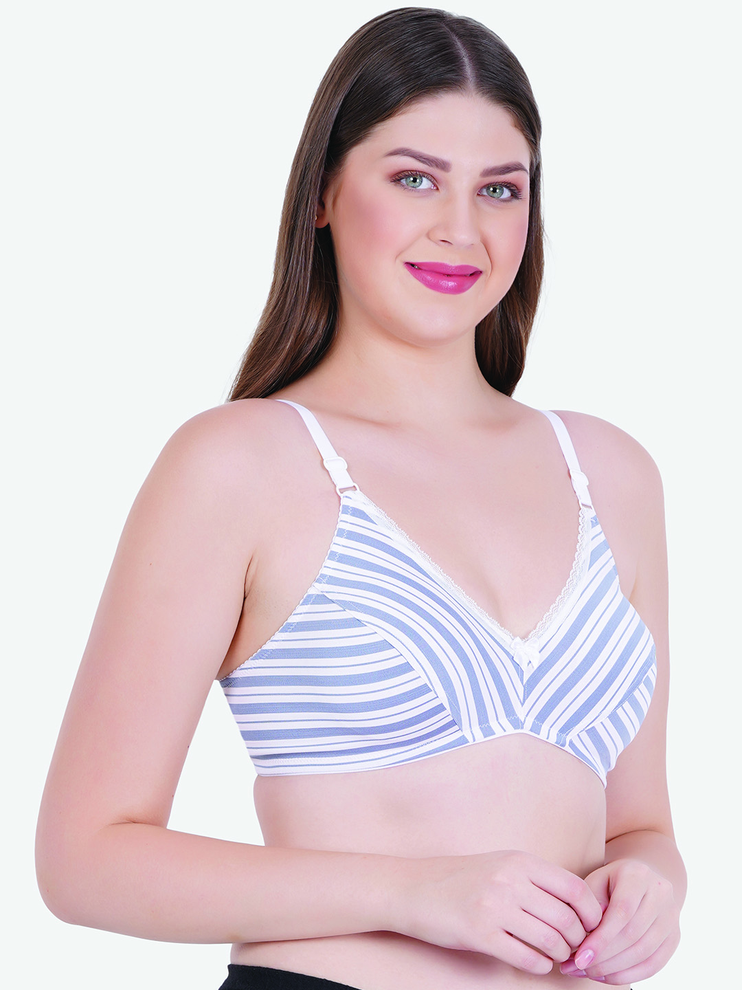 Featuring a non-padded, wire-free design, this bra offers a natural shape and relaxed fit—perfect for everyday wear. The elegant purple and white stripe pattern gives it a modern, youthful look, while the delicate lace trim along the neckline adds a subtle feminine charm.