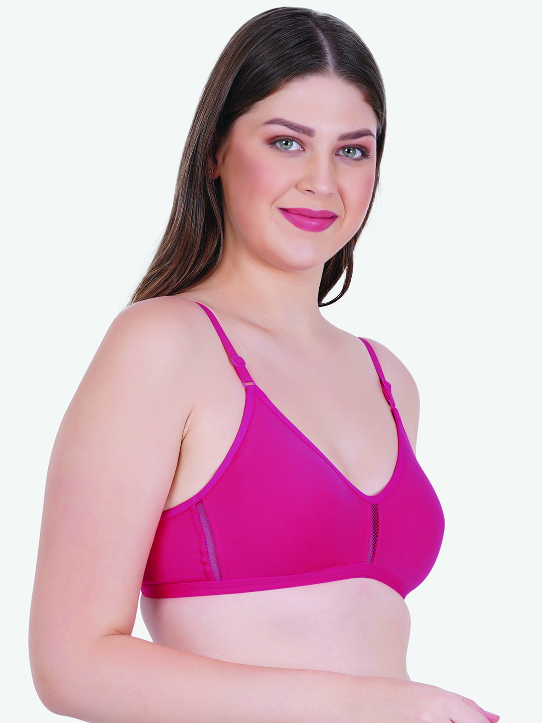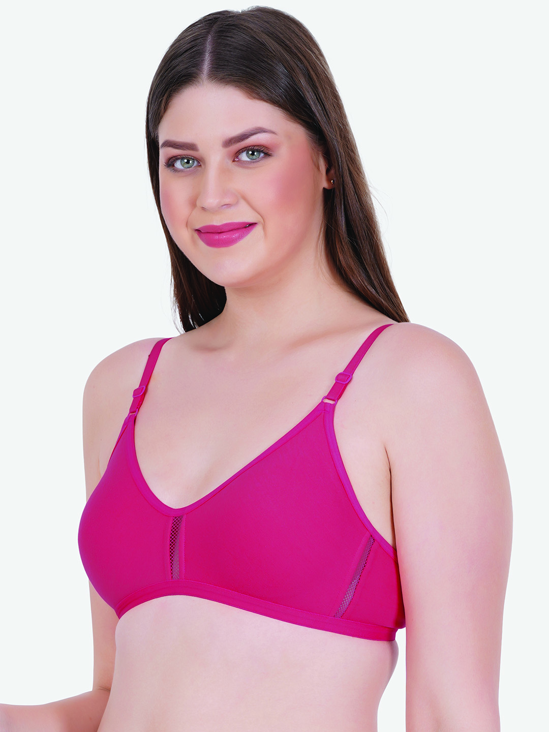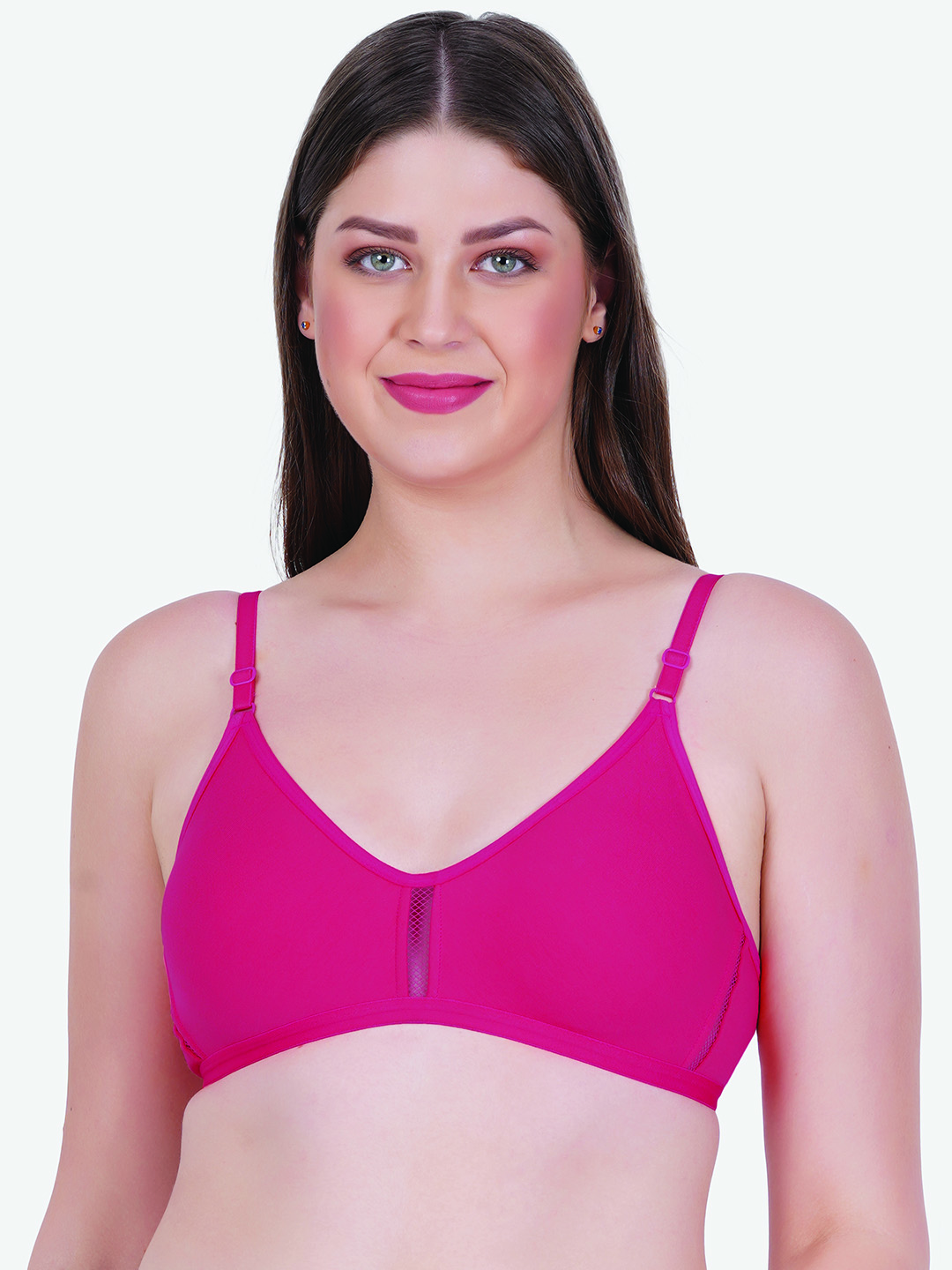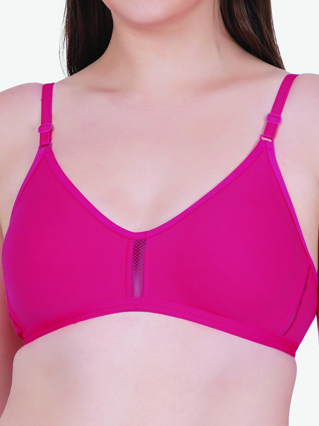 This non-padded, non-wired bra ensures unrestricted movement and a lightweight fit, making it ideal for daily use, lounging, or light activities. The seamless cups provide a sleek finish under clothing, while the subtle mesh panel at the center adds a touch of style and enhanced breathability.