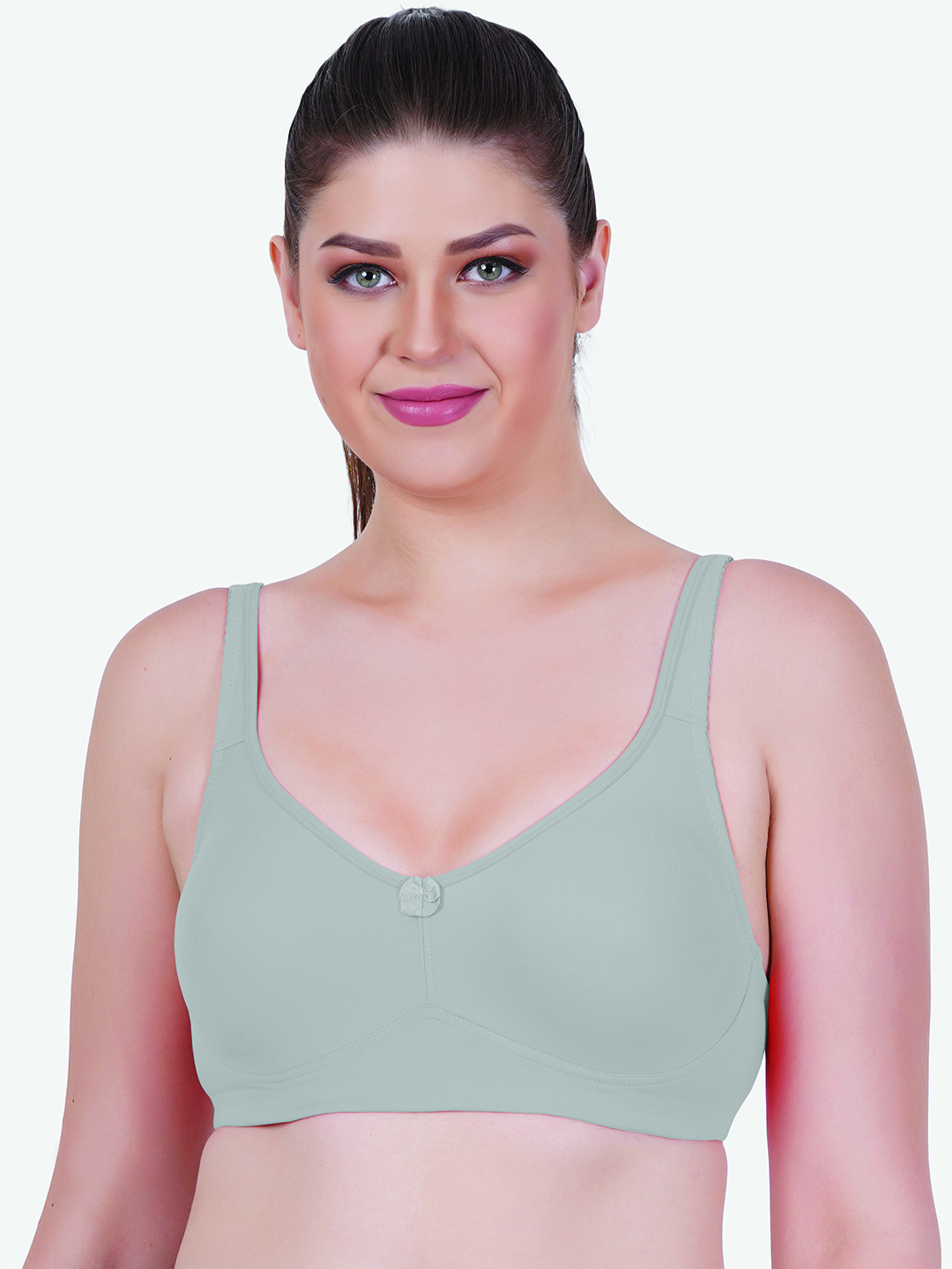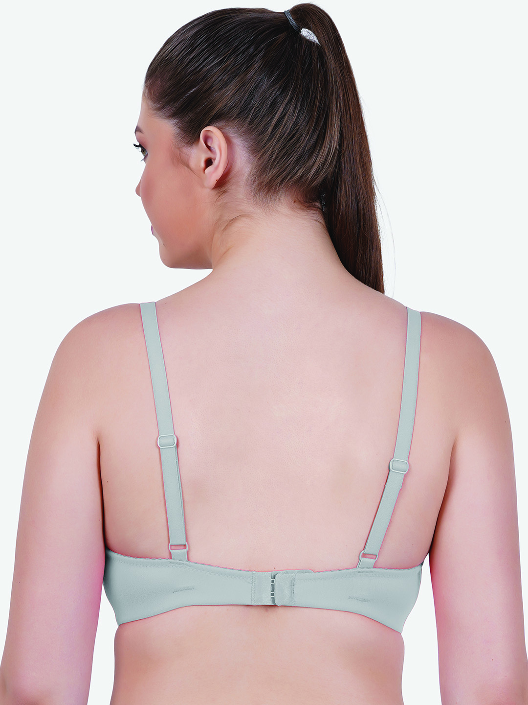 The bra features adjustable shoulder straps for a personalized fit and a secure back hook closure for added convenience. Its seamless finish ensures a no-show look under fitted tops, while the elegant center detailing adds a subtle feminine touch.
